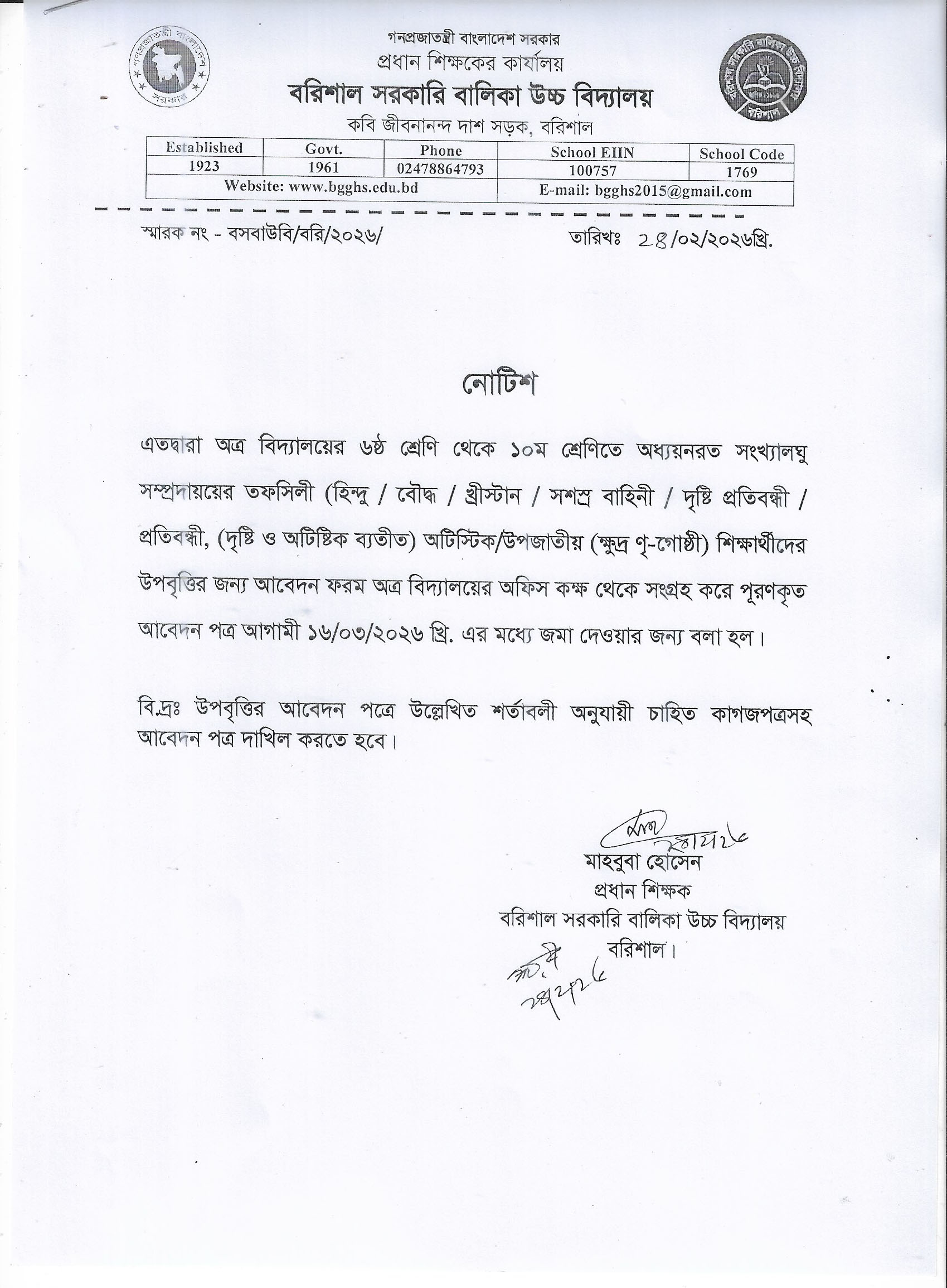 ৬ষ্ঠ-১০ম শ্রেণি তফসিলী উপবৃত্তি ফরম ১৬/৩/২৬ খ্রি. এর মধ্যে অত্র অফিস চলাকালীন সময়ে জমা দিতে হবে।